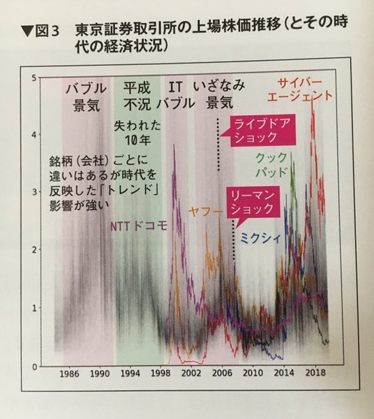 記事の中に、たとえば(小さく配置された)図3とか図7の株価グラフの中に、30年間くらいの色んな企業の毎日が詰まっています。だから、そのグラフに書かれた社名の中の人たちには、少し面白いかも、と思います。昭和・平成・令和を生きてる世代には、色んな意味で絶対面白いはずの記事になります。