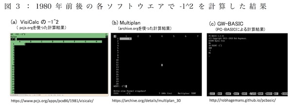 エクセルやMultiplanが発売当時を調べてみると、面白いことがわかります。表計算ソフトという形態を作り出したVisiCalcも、当時の表計算ソフトの用途と重なるところも多かったデータベースソフトdBaseでも、ビジネスプログラミング言語のCOBOLも、多くのソフトでエクセルと同じ演算結果を出力します(図2、図3)。  そんな時代背景を踏まえれば、エクセルが「単項演算子―は2項演算子^に優先する」という仕様にしたということも、いたって自然にも思えてきます。